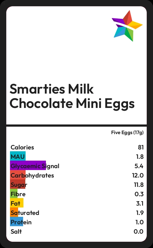 Smarties Milk Chocolate Mini Eggs contains 80.8 calories in five Eggs (17g).