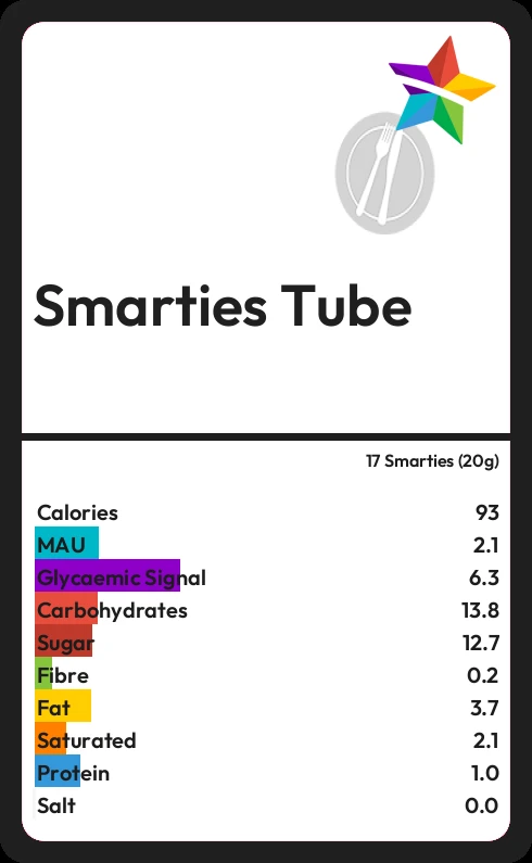 Smarties Tube contains 92.8 calories in 17 Smarties (20g).