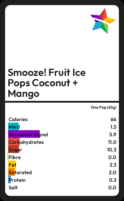 Smooze! Fruit Ice Pops Coconut + Mango contains 10.3g sugar in one Pop (65g) - that is around 3 cubes of sugar.