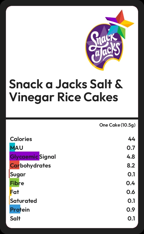 Snack a Jacks Salt & Vinegar Rice Cakes contains 0.1g sugar in one Cake (10.5g)