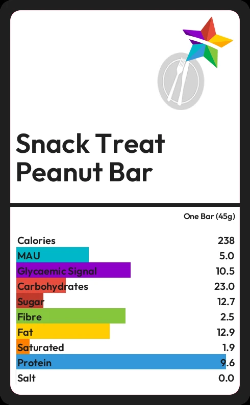 Snack Treat Peanut Bar contains 12.7g sugar in one Bar (45g) - that is around 3 cubes of sugar.