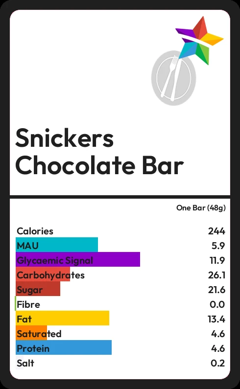 Snickers Chocolate Bar contains 21.6g sugar in one Bar (48g) - that is around 5 cubes of sugar.