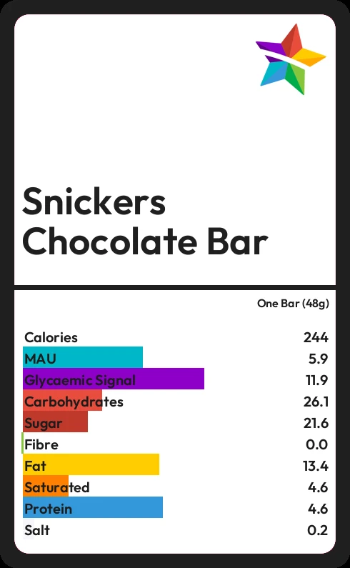Snickers Chocolate Bar contains 21.6g sugar in one Bar (48g) - that is around 5 cubes of sugar.
