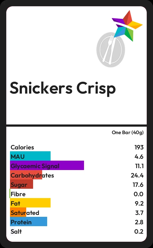 Snickers Crisp contains 17.6g sugar in one Bar (40g) - that is around 4 cubes of sugar.