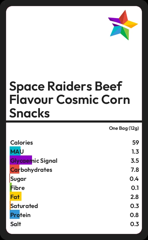 Space Raiders Beef Flavour Cosmic Corn Snacks contains 0.4g sugar in one Bag (12g)