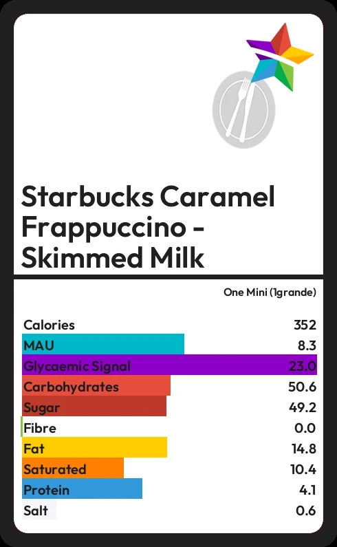 Starbucks Caramel Frappuccino - Skimmed Milk contains 352 calories in one Mini (1grande).