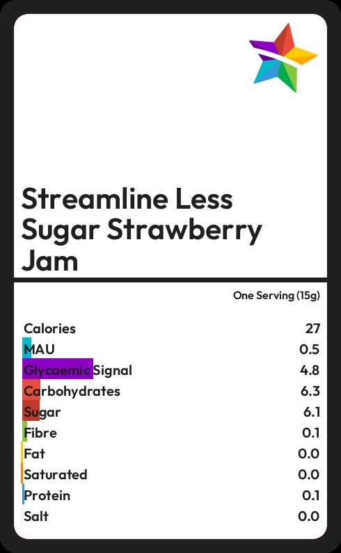 Streamline Less Sugar Strawberry Jam contains 6.1g sugar in one Serving (15g) - that is around 2 cubes of sugar.