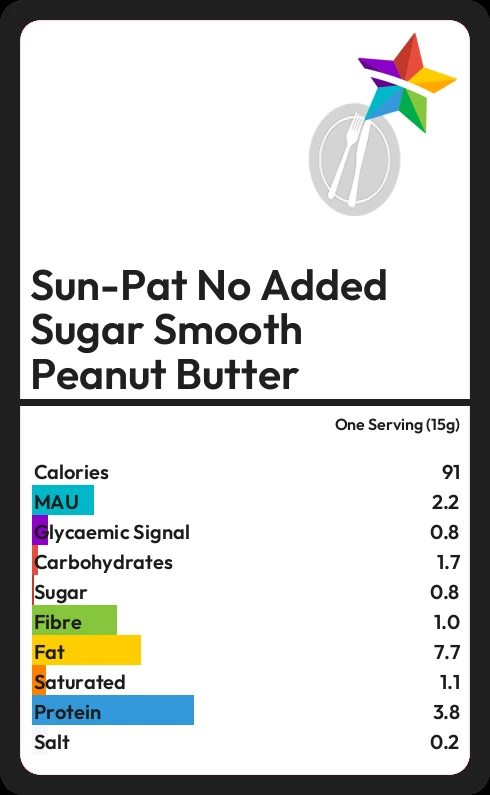 Sun-Pat No Added Sugar Smooth Peanut Butter contains 90.9 calories in one Serving (15g).