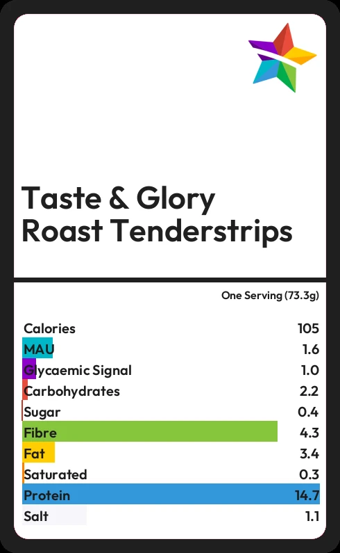 Taste & Glory Roast Tenderstrips contains 104.8 calories in one Serving (73.3g).