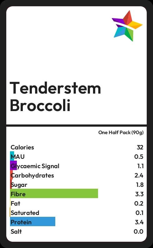 Tenderstem Broccoli contains 31.5 calories in one Half Pack (90g).