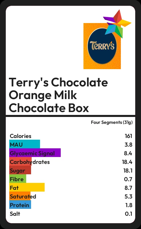 Terry's Chocolate Orange Milk Chocolate Box contains 161.5 calories in four Segments (31g).