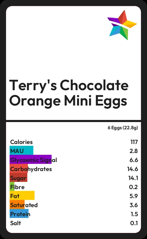 Terry's Chocolate Orange Mini Eggs contains 14.1g sugar in 6 Eggs (22.8g) - that is around 4 cubes of sugar.