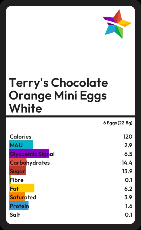 In 6 Eggs (22.8g) of Terry's Chocolate Orange Mini Eggs White there are 6.2g of fat of which 3.9g are saturated.