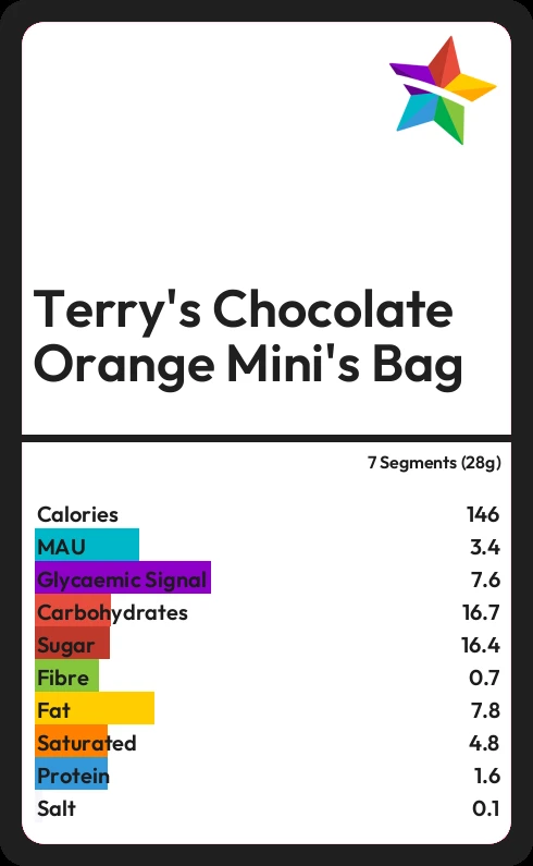 Terry's Chocolate Orange Mini's Bag contains 16.4g sugar in 7 Segments (28g) - that is around 4 cubes of sugar.