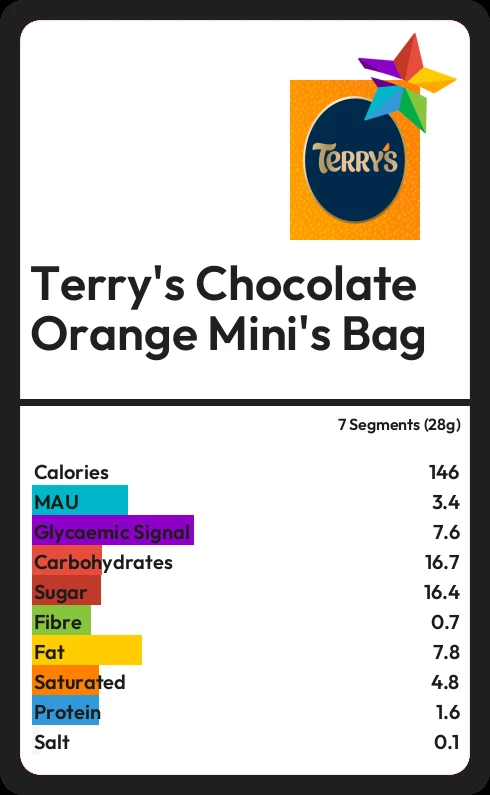 Terry's Chocolate Orange Mini's Bag contains 16.4g sugar in 7 Segments (28g) - that is around 4 cubes of sugar.