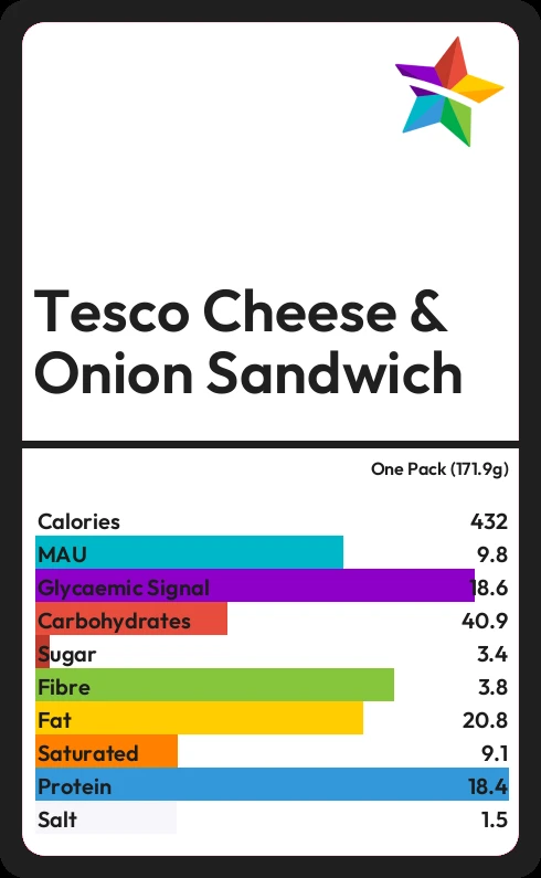 Tesco Cheese & Onion Sandwich contains 431.5 calories in one Pack (171.9g).