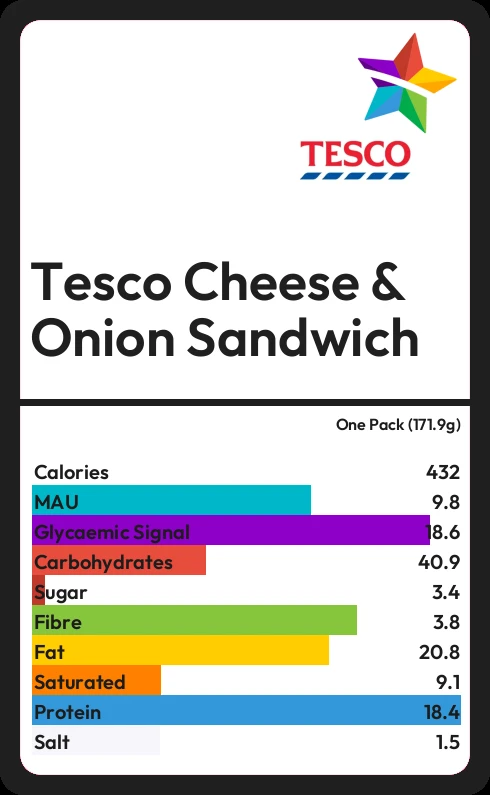Tesco Cheese & Onion Sandwich contains 431.5 calories in one Pack (171.9g).