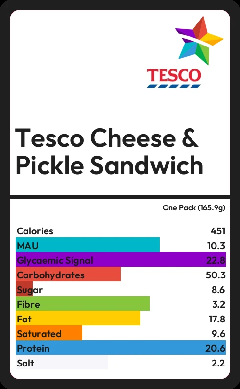 Tesco Cheese & Pickle Sandwich contains 451.2 calories in one Pack (165.9g).