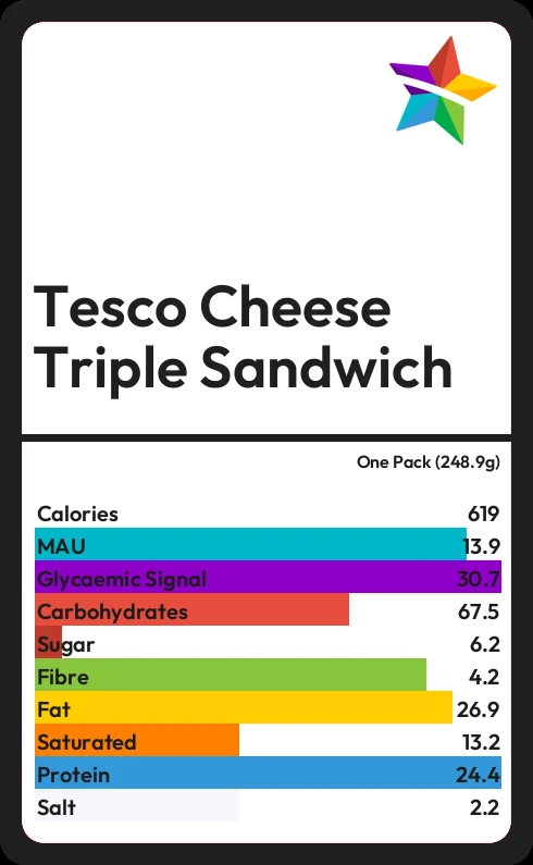 Tesco Cheese Triple Sandwich contains 619.8 calories in one Pack (248.9g).