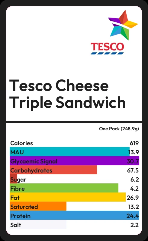 Tesco Cheese Triple Sandwich contains 619.8 calories in one Pack (248.9g).