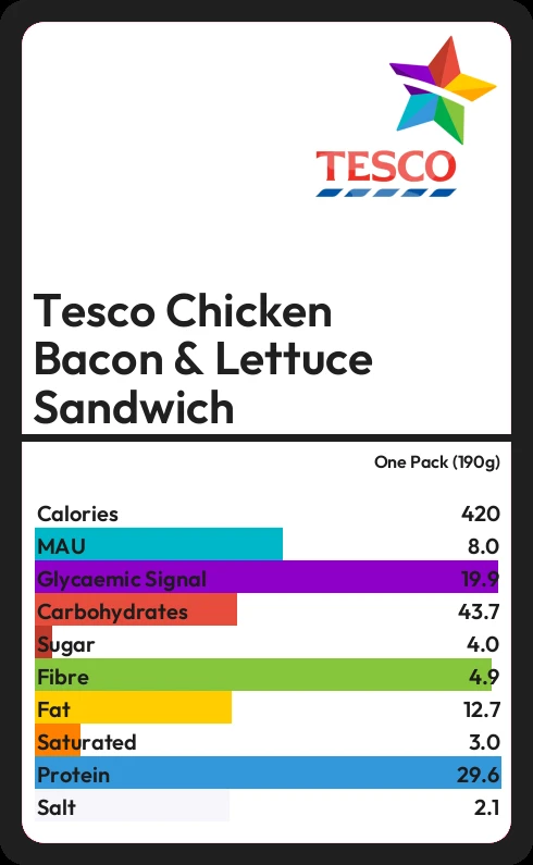 Tesco Chicken Bacon & Lettuce Sandwich contains 4.0g sugar in one Pack (190g) - that is around 1 cube of sugar.