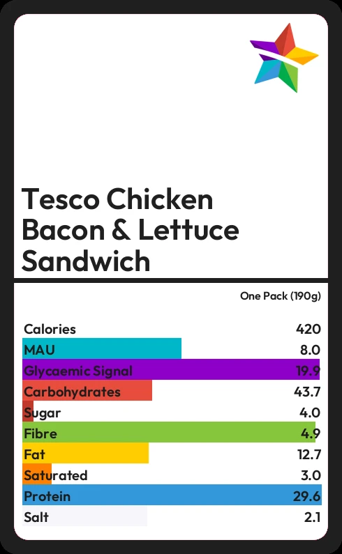 Tesco Chicken Bacon & Lettuce Sandwich contains 4.0g sugar in one Pack (190g) - that is around 1 cube of sugar.