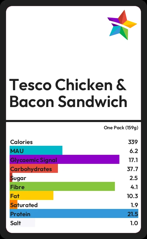 Tesco Chicken & Bacon Sandwich contains 340.3 calories in one Pack (159g).