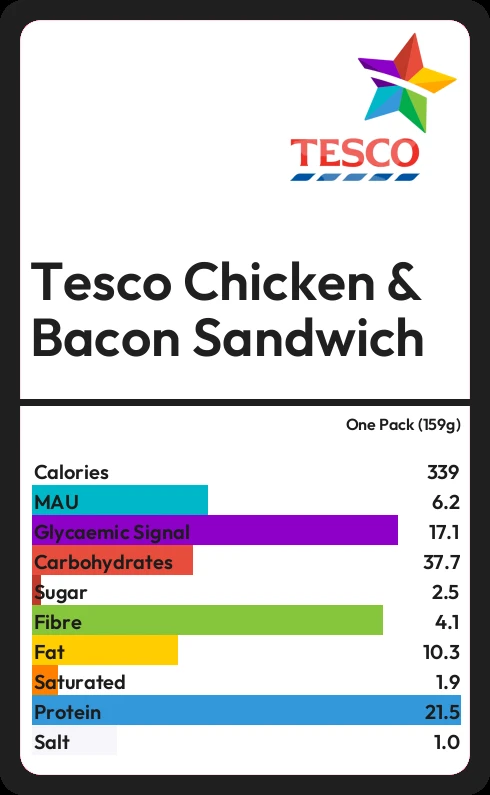 Tesco Chicken & Bacon Sandwich contains 340.3 calories in one Pack (159g).