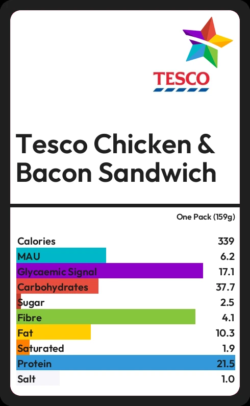 Tesco Chicken & Bacon Sandwich contains 340.3 calories in one Pack (159g).
