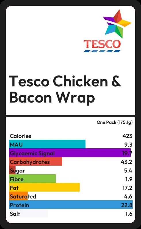 Tesco Chicken & Bacon Wrap contains 423.7 calories in one Pack (175.1g).