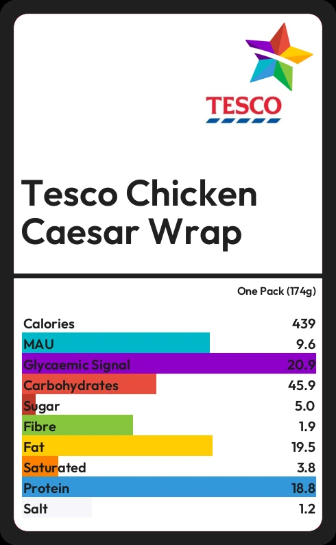 Tesco Chicken Caesar Wrap contains 5.0g sugar in one Pack (174g) - that is around 1 cube of sugar.