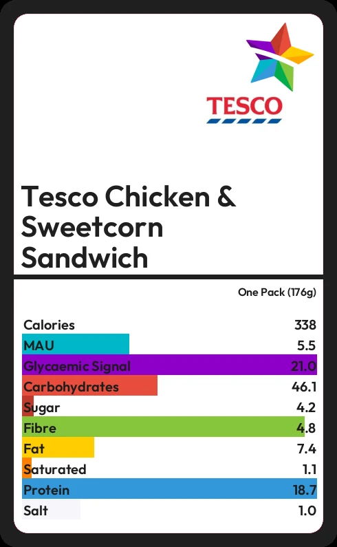 Tesco Chicken & Sweetcorn Sandwich contains 337.9 calories in one Pack (176g).