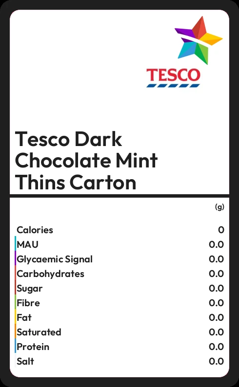 Tesco Dark Chocolate Mint Thins Carton contains 58.7g sugar in 100g - that is around 15 cubes of sugar.