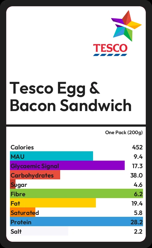 Tesco Egg & Bacon Sandwich contains 4.6g sugar in one Pack (200g) - that is around 1 cube of sugar.