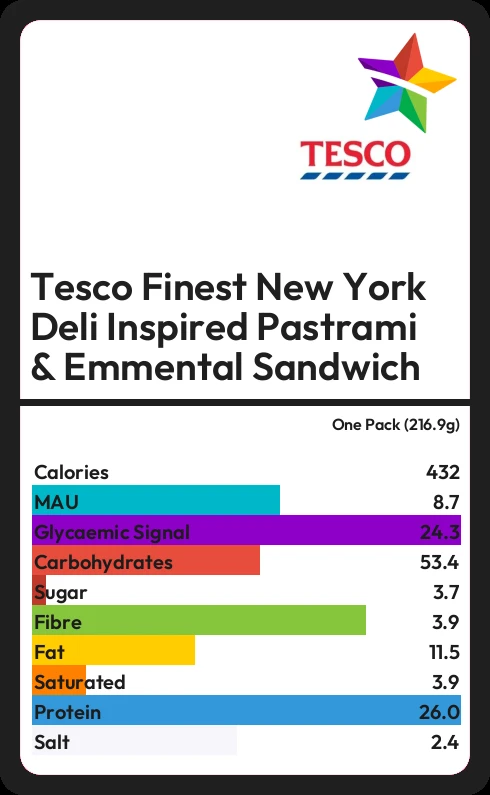 Tesco Finest New York Deli Inspired Pastrami & Emmental Sandwich contains 431.6 calories in one Pack (216.9g).