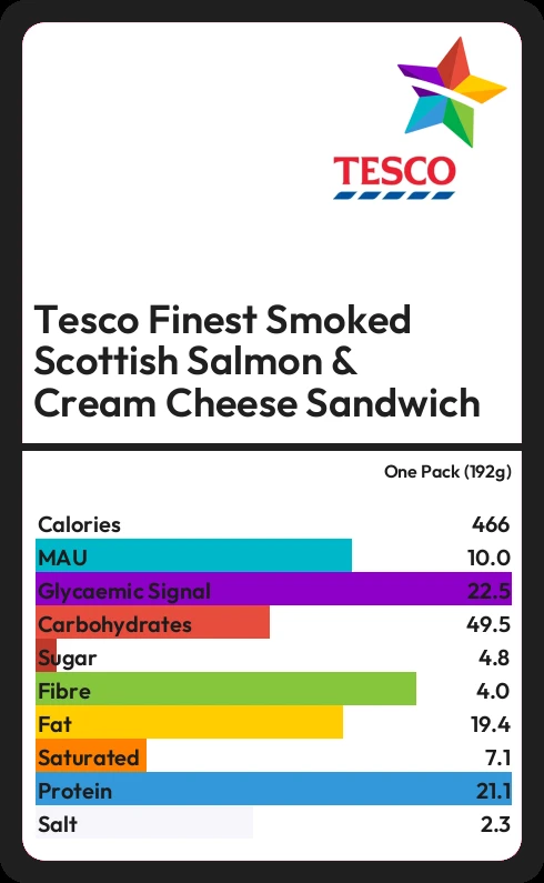 Tesco Finest Smoked Scottish Salmon & Cream Cheese Sandwich contains 466.6 calories in one Pack (192g).