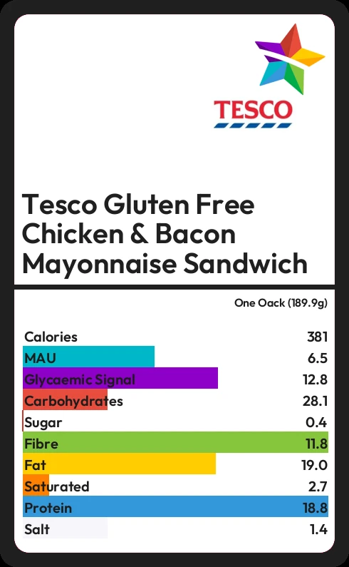 Tesco Gluten Free Chicken & Bacon Mayonnaise Sandwich contains 0.4g sugar in one Oack (189.9g)