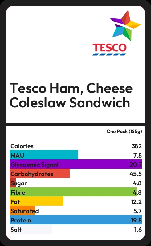 Tesco Ham, Cheese Coleslaw Sandwich contains 383 calories in one Pack (185g).