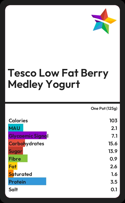 Tesco Low Fat Berry Medley Yogurt contains 102.5 calories in one Pot (125g).