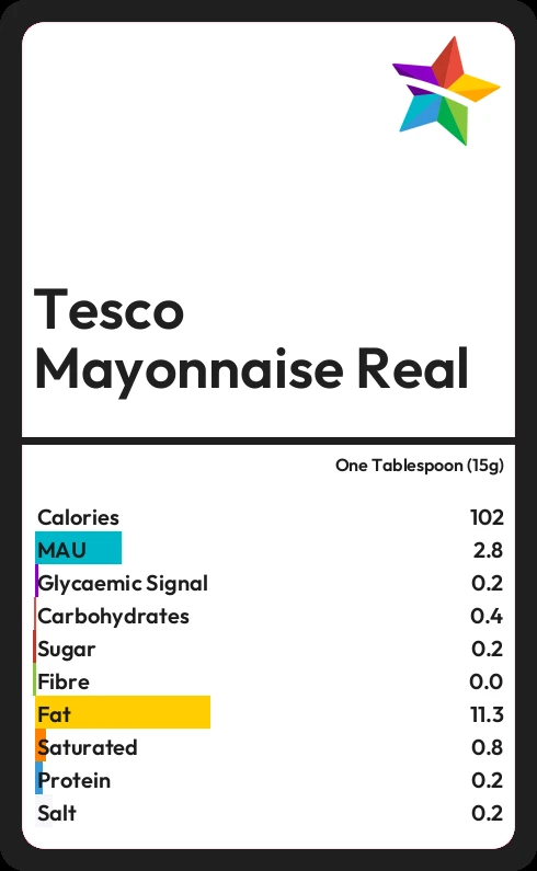 In one Tablespoon (15g) of Tesco Mayonnaise Real there are 11.3g of fat of which 0.8g are saturated.