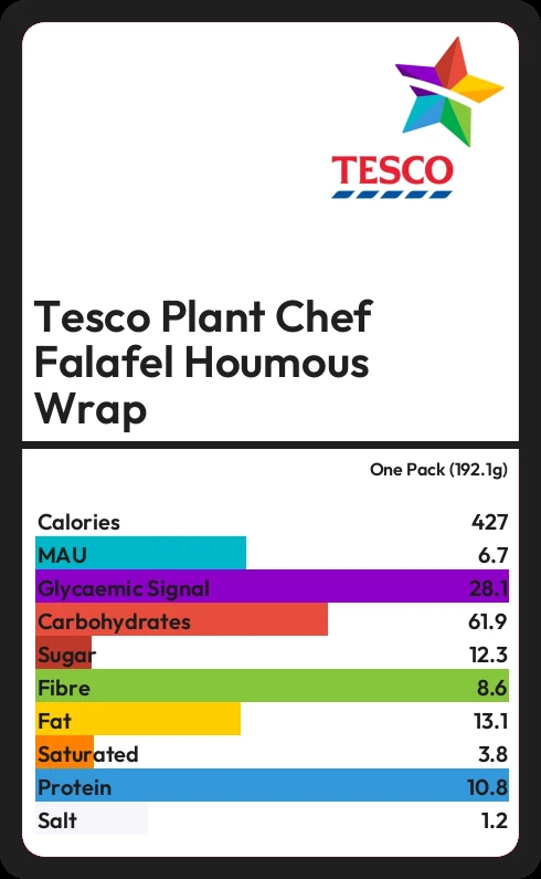 Tesco Plant Chef Falafel Houmous Wrap contains 426.5 calories in one Pack (192.1g).