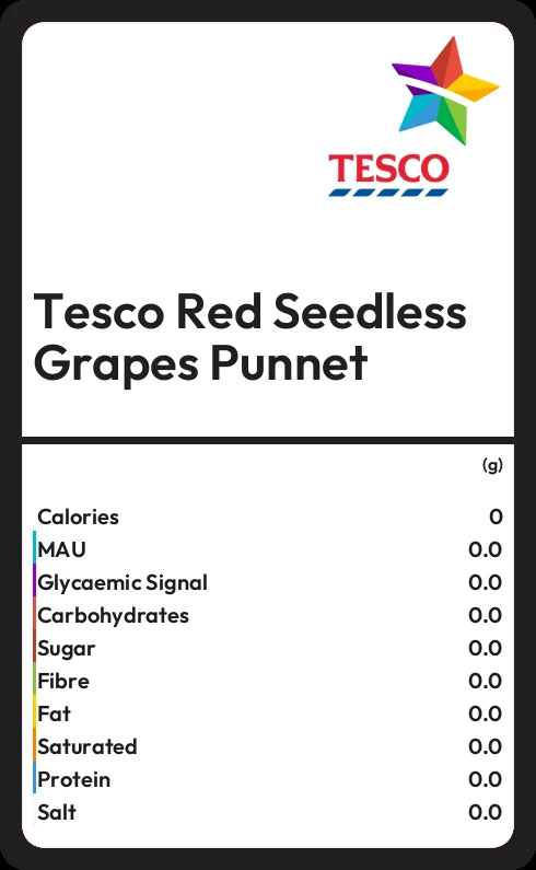 Tesco Red Seedless Grapes Punnet contains 74 calories in 100g.