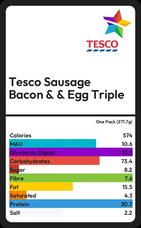 Tesco Sausage Bacon & & Egg Triple contains 8.2g sugar in one Pack (271.7g) - that is around 2 cubes of sugar.