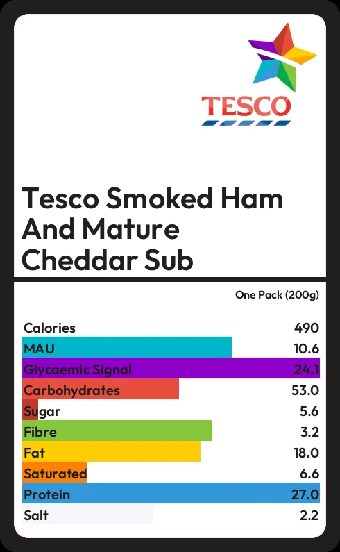 Tesco Smoked Ham And Mature Cheddar Sub contains 5.6g sugar in one Pack (200g) - that is around 1 cube of sugar.