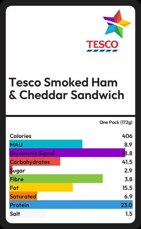Tesco Smoked Ham & Cheddar Sandwich contains 405.9 calories in one Pack (172g).