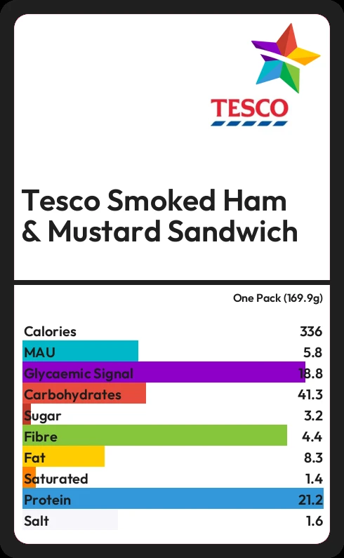 Tesco Smoked Ham & Mustard Sandwich contains 3.2g sugar in one Pack (169.9g) - that is around 1 cube of sugar.
