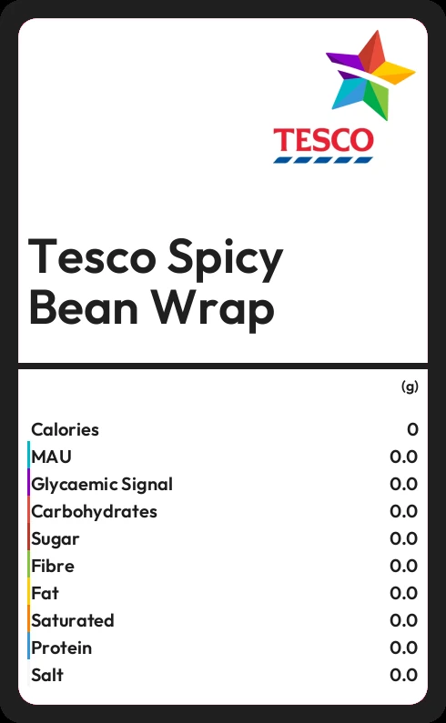 Tesco Spicy Bean Wrap contains 214 calories in 100g.
