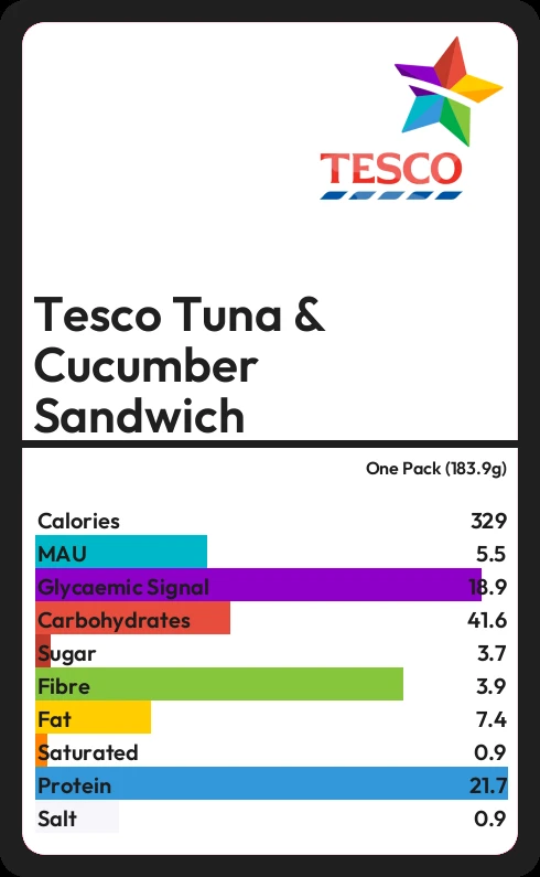 Tesco Tuna & Cucumber Sandwich contains 329.2 calories in one Pack (183.9g).