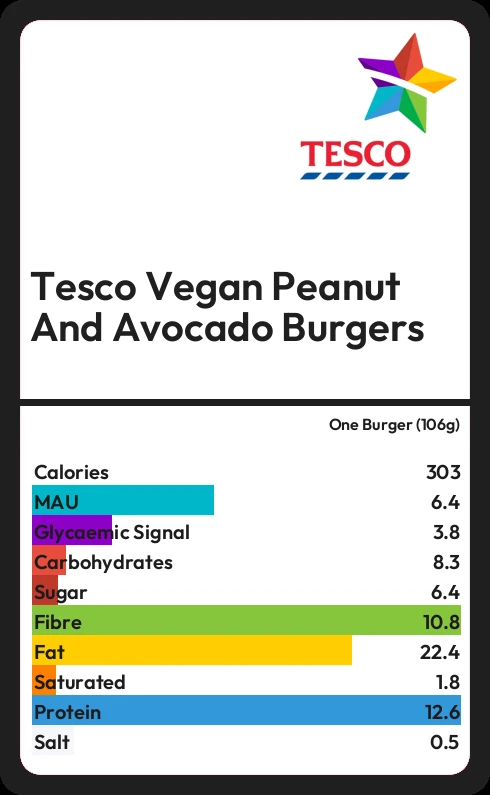 Tesco Vegan Peanut And Avocado Burgers contains 303.2 calories in one Burger (106g).
