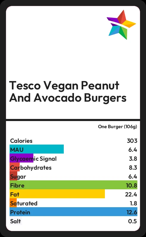 Tesco Vegan Peanut And Avocado Burgers contains 303.2 calories in one Burger (106g).